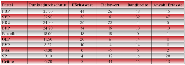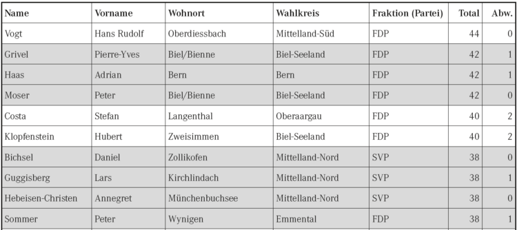 Die FDP.Die Liberalen Kanton Bern gratuliert FDP-Grossrat Hans Rudolf Vogt, Oberdiessbach zum Sieg des diesjährigen Grossratsratings des Handels- und Industrievereins des Kantons Bern. Besonders eindrucksvoll ist die Tatsache, dass die FDP gleich die Ränge 1 bis 6 stellt. Die FDP gewinnt denn auch das Parteienrating deutlich mit 8 Punkten Vorsprung. Einmal mehr wird klar: Die FDP ist die wirtschaftsfreundlichste Partei im Kanton Bern.